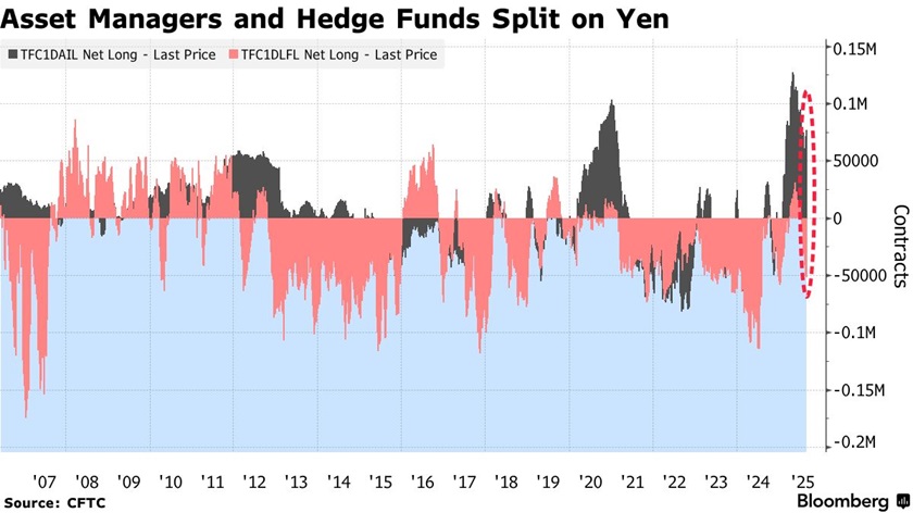 美邦商品期货来往委员会(CFTC)的每周数据显示,本月买入日元的资产治理公司与卖出日元的杠杆基金之间的差异放大至2007年以后的最高秤谌。
