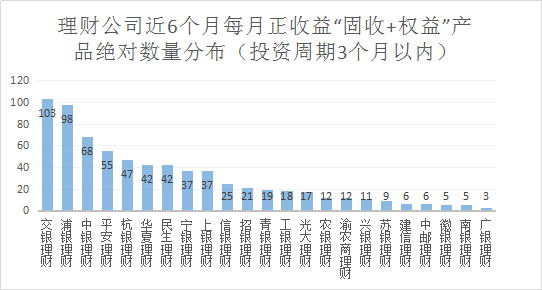 从绝对数目看,近6个月完毕月月正收益的698只产物中,交银理财和浦银理财数目较众,阔别为103只、98只。中银理财和安然理财正收益产物数目也超50只,依序为68只、55只。