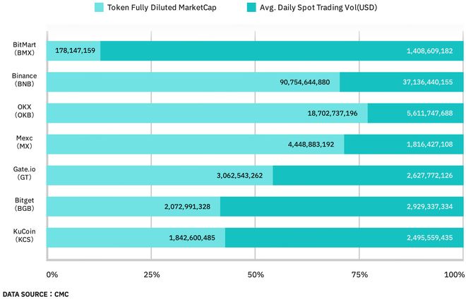 为了进一步证明各大平台币的商场潜力和投资代价,咱们援用了一张根源于 CoinMarketCap 的数据图外。该图外映现了7个差别平台币的十足稀释市值 (Token Fully Diluted Market Cap) 与逐日均匀现货买卖量 (Avg. Daily Spot Trading Vol.) 的对照境况。从图外中能够看出,像 BNB 和 OKB 如此的一线买卖所平台币,其买卖量与市值比例相对较低。然而,片面二线买卖所平台币,如 BMX、BGB 和 KCS,正在买卖量与市值比例方面却压倒元白。希罕值得一提的是,BMX 的这一比例正在总共平台币中尤为卓越,这也许意味着 BMX 的代价目前被商场低估了。